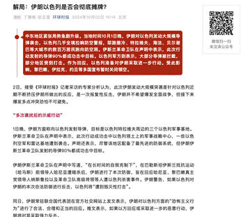 七、2024年10月2日接受《环球时报》公众号采访,题目为《解局:伊朗以色列是否会彻底摊牌?》