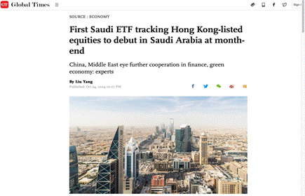 八、10月24日在环球时报(英文版)发表题为《First Saudi ETF tracking Hong Kong-listed equities to debut in Saudi Arabia at month-end》的评论文章