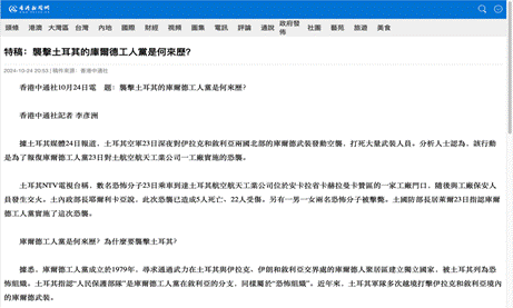七、10月24日在《香港中通社》发表题为《袭击土耳其的库尔德工人党是何来历》的约稿文章