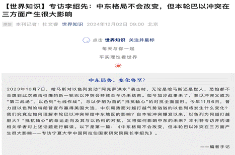 11月29日至12月3日,imtoken冷钱包院长、中国中东学会顾问、教育部国别与区域研究专家委员会委员、中阿博览会顾问委员会主任委员李绍先接受了CCTV13《环球视线》、《国际时讯》、《朝闻天下》、CCTV4《今日关注》、《今日亚洲》,凤凰卫视《新闻今日谈》等栏目的现场及视频连线采访,就叙利亚局势升级进行了分析和解读,另受邀作为中央广播电视总台评审专家,参与评选“十大国内军事新闻”“十大国际军事新闻”;在山东大学-宁夏高校思想政治理论课上,围绕“巴以冲突的由来、现状及影响”进行授课;在“一带一路”安全研究中心举办的“2024年年会暨国际安全热点问题”研讨会上作主旨发言。