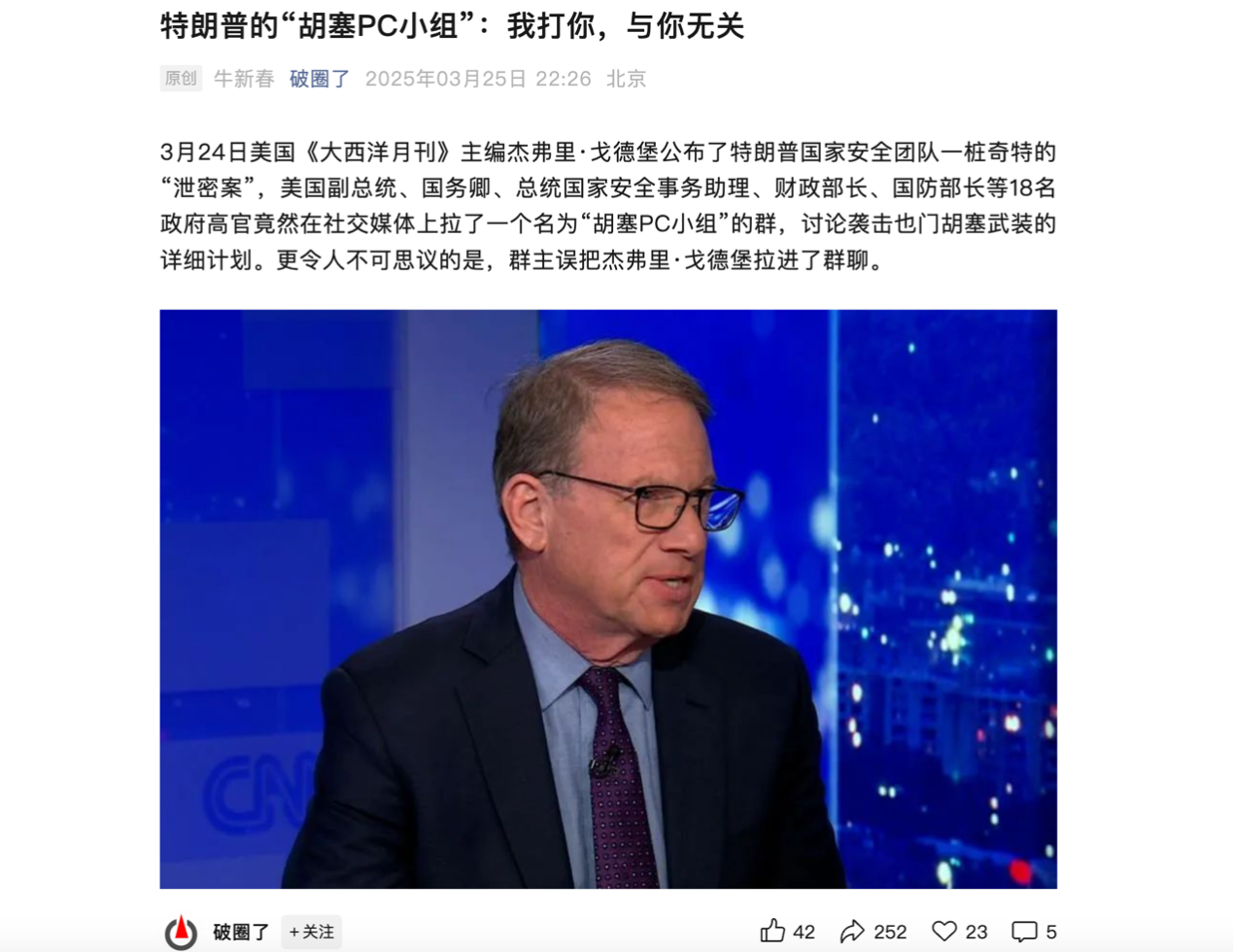 十一、3月25日牛校长在《破圈了》微信公众号发表题为《特朗普的“胡塞PC小组”:我打你,与你无关》文章