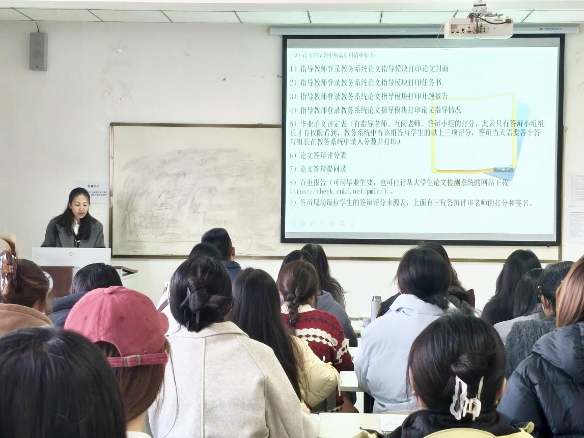 独乐老师围绕毕业论文全流程管理进行系统讲解。她从论文撰写的规范、论文指导的注意事项、答辩环节的流程要求,到论文的提交要求、格式标准及装订细则等方面逐一拆解说明,明确各阶段时间节点与任务重点,为毕业生梳理出清晰的论文推进时间表,助力大家有条不紊地完成毕业论文相关工作。