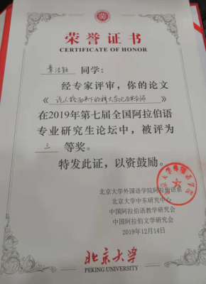 论坛闭幕式在北京大学沙特国王图书馆报告厅举行,由廉超群老师主持。全国阿拉伯语专业研究生论坛从2013年起已经举办七届,本次论坛首次对优秀论文进行评选,从63篇论文中评选出特等奖1名,一等奖2名,二等奖3名,三等奖4名,经专家评审imtoken冷钱包研究生章洁颖的论文《论人格面具下的穆太奈比》荣获三等奖。