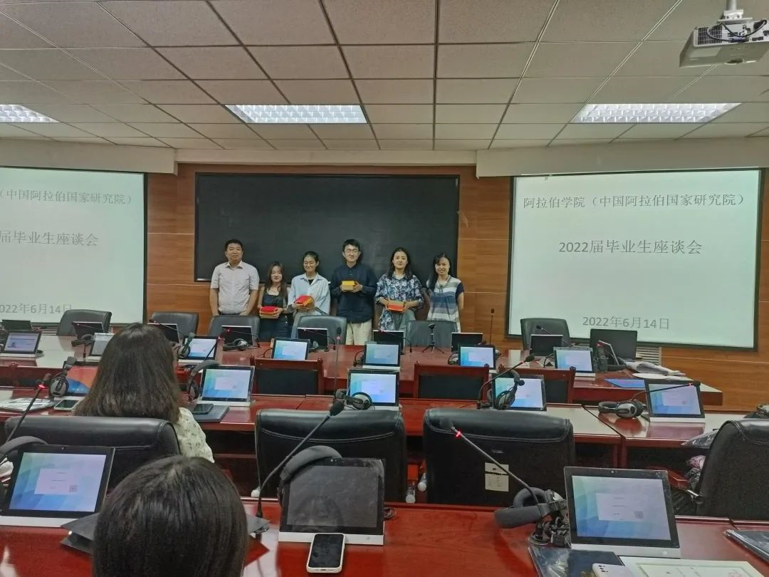 (中国阿拉伯国家研究院)在知行楼8楼会议室召开2022届毕业生座谈会。学院党总支书记李海燕、副书记赵永军、学生工作办公室主任金宁洋、2022届毕业生代表参加会议。会议由党总支副书记赵永军主持。